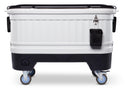 Ultratherm insulated body - long ice retention. Cool riser technology. Elevated base makes it easier to reach into cooler. Heavy-duty locking caster wheels. Removable drink dividers help separate among beverage types. Convenient stainless steel bottle opener with catch bin for caps. Removable lid transforms to an open-air beverage cooler. Utility loops hold towels and trash bags. Heavy-duty swing-up side handles. Removable base and wheels. Capacity: 158 12oz cans 125-Quarts. Made in the USA. Dimensions: 39.1"L x 21.8"W x 26.9"H.