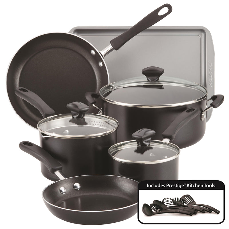 Crafted from heavy-duty aluminum for excellent heat distribution. Superior DiamondMax nonstick interior that perform 3X better than ceramic nonstick. Pots and pans are oven safe up to 350F. Feature comfortable handles for a confident grip. Shatter-resistant glass lids. All pieces are dishwasher safe. Includes: 1qt Covered saucepan. 2qt Covered straining saucepan. 5qt Covered Dutch oven. 8" Skillet. 9.75" Skillet. 9 x 13" Cookie sheet. 6 Prestige nylon tools: Slotted tuner. Slotted spoon. Solid spoon. Pasta fork. Whisk. Ladle.