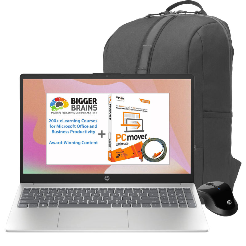 The HP 15.6" Laptop PC with 4GB memory, 128GB solid state drive, and the reliable power of an Intel Celeron Processor empowers you to do more with ample storage and powerful graphics. Built with ocean-bound and post-consumer recycled plastics. Full size keyboard with numeric keypad. Windows 11 Home. Wireless and Bluetooth connectivity, plus integrated webcam, digital microphones, USB ports, and HDMI. Includes wireless mouse, backpack, 1-year membership to Bigger Brains elearning courses, LapLink PC Mover Ultimate software with high-speed transfer cable.