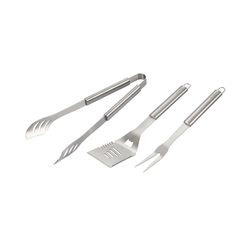 Easily grab turn and serve your BBQ meals with this outdoor BBQ bundle. Tools are made from durable stainless steel with a brushed handle. Generous length keeps hands safe while grilling. Looped handle makes it easy to hang. Side ridges on the slotted turner and tongs designed to clean grill grates. Slots on the slotted turner allow grease to drain away. Tongs have wide opening spring mechanism. Built-in bottle opener on turner. Scratch and rust resistant. Dishwasher safe. Includes: Slotted turner. Tongs. Two prong fork.