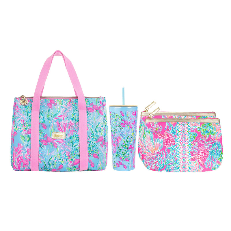 Take your favorites to go the Lilly way with this portable lunch bundle. The large lunch tote is easy-to-clean with an insulated interior. With two long shoulder straps, this lunch cooler makes it super easy to take when you're on the go. Sip in style with this 24oz printed acrylic tumbler. Complete with a gold twist-off lid and reusable straw, it's equal parts fashionable and functional. The insulated travel bags are sized perfectly to toss into your lunch or beach bag.