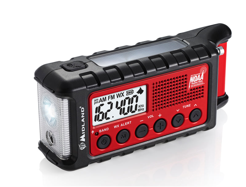 NOAA Weather alert radio. Crank or solar backup power. Charges phones tablets and more. Battery lasts up to 32 hours. CREE LED flashlight with strobe. Morse code flashlight beacon. AM/FM Radio tuning. Dog whistle. USB port for charging. Alerts for tornadoes floods storms fires and earthquakes. Built-in 2600mAh lithium-ion battery.