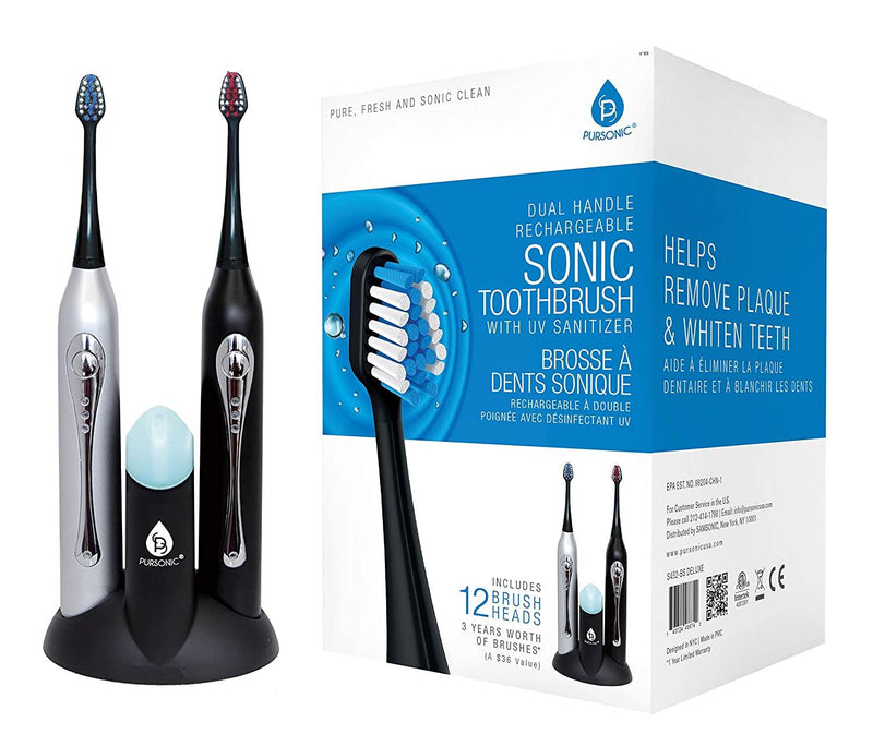Sonic rechargeable toothbrush features a built -in UV Sanitizer designed to kill 99.9% of bacterium and germs on the brush heads. Sonic wave technology provides up to 45,000 sonic strokes per minute to effectively remove plaque without irritating your gums. Ideal for those hard-to-reach areas and removes even the toughest stains. System includes 12 Bonus Brush heads. Dual handle with fashionable silver and black design. Utilizes germicidal UV bulb to kill 99.9% of bacterium and germs left on the brush heads. Runs on a Lithium Ion battery.