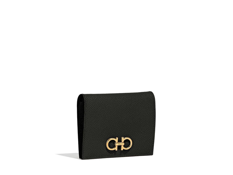 Compact, elegant, and functional, this French wallet is made of hammered calfskin leather with a fine grainy texture. The signature Gancini buckle in an antique gold hue adds a striking touch of lux, while the neatly organized interior has bill compartments, slit pockets, and card slots, plus a practical coin pocket with a snap button closure. Composition: Hammered Calfskin.
