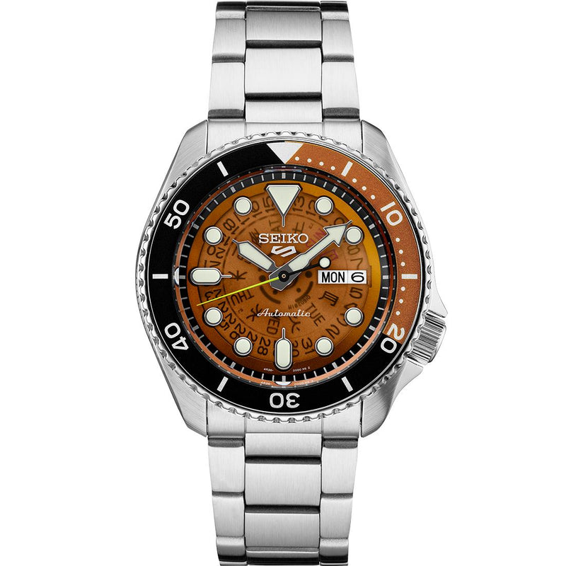 New Seiko 5 Sports models pay homage to Seiko's beloved archive of the 1970s: ÒTime sonar." Unique specification that shows the workings of the watch by showing the day-date disk through the translucent dial. Since the day-date disk can be seen through, different design can be enjoyed depending on the language of the local calendar. The coloring is also an homage to ÒTime Sonar" and has an accent color on the seconds hand which is a symbolic coloring pattern