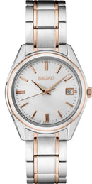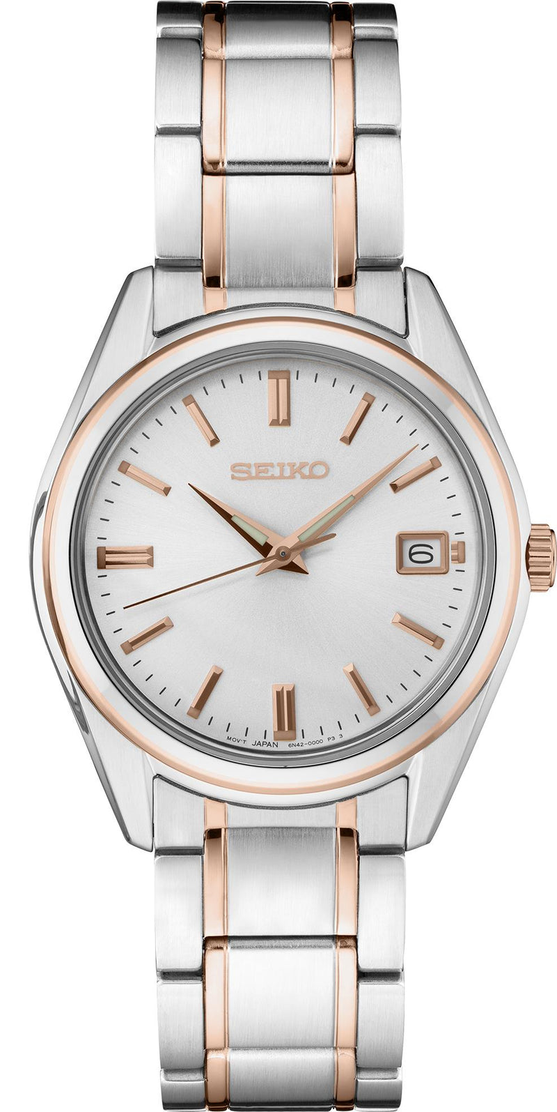 From the Essentials Collection. With classic dress/sport styling, this perfectly tailored design combines sophisticated minimalism with versatility. The sunray-finish silver dial features a date calendar and LumiBrite hands. In stainless steel, with rose-gold two-tone finish, and sapphire crystal for superior scratch resistance. 10 bar, 100M Water Resistant