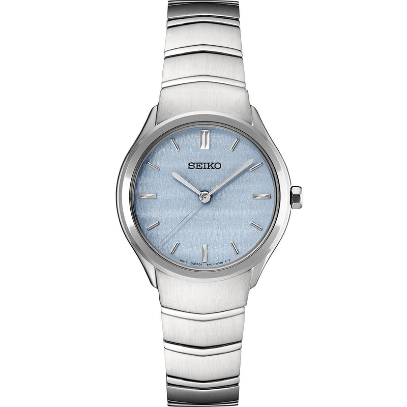 From the Essentials Collection. With sleek sophistication, this distinctively modern watch makes an immediate style statement. The clean, minimalist dial, in pale blue with simple stick markers, features a subtly varying metallic texture for added visual interest, while the soft curves of the bracelet are highlighted by a mirror and hairline finish. In stainless steel, this memorable timepiece includes a tri-fold push button release clasp. 5 bar, 50M Water Resistant