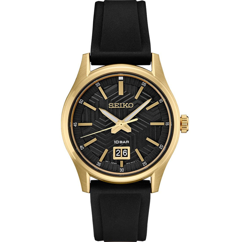 From the Essentials Collection. Designed to evoke the cool excitement of a night run, this smooth watch offers a slim profile for sleek sport or everyday wear. This subtly updated watch adds a streetwear edge with the y-shaped shoe-sole inspired pressed pattern on its matte textured black dial with gold accents. With big date calendar and LumiBrite hands and markers, this distinctive timepiece features a stainless steel case with gold finish, secure screwdown caseback, scratch-resistant sapphire crystal and black silicone strap.