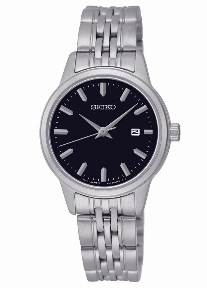 This beautiful ladies' dress watch, exclusive from Seiko, features a stainless steel case and bracelet with black dial, three-hand movement, date calendar and push button release clasp with 50 meters water resistance.