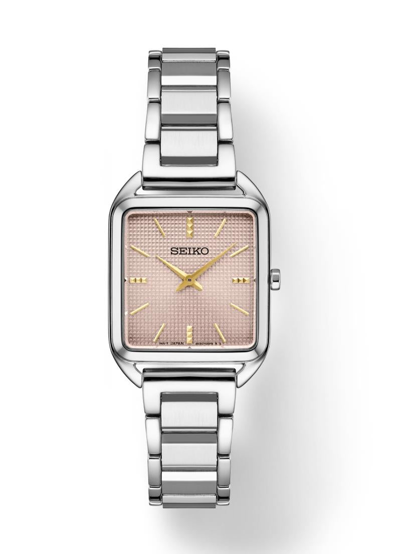 New Essentials Ladies' models with a fresh square case design. The light and slim watch case made in the right proportions to perfectly fit a ladies' wrist. The surface of the dial is covered in die-stamped grid pattern, showing a hint of luxury in a simple, clean design. Dial variations in trendy muted color such as olive green and mauve pink to add a sophisticated touch.