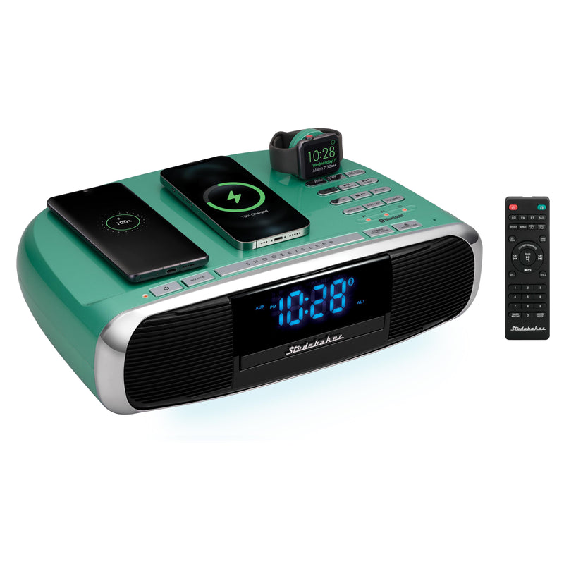 15W Qi Power Transmission Pad. Smartphone Charging. Air Pod Charging through USB Port. Charge your Apple Watch, Android Phone, iPhone, and iPad. Bluetooth Transmit and Receive. Aux-In. USB Port. Tray Loading CD Player. Dual Alarm Clock with Snooze & Sleep. Dimmer Control. 1.5" Blue LED Display.