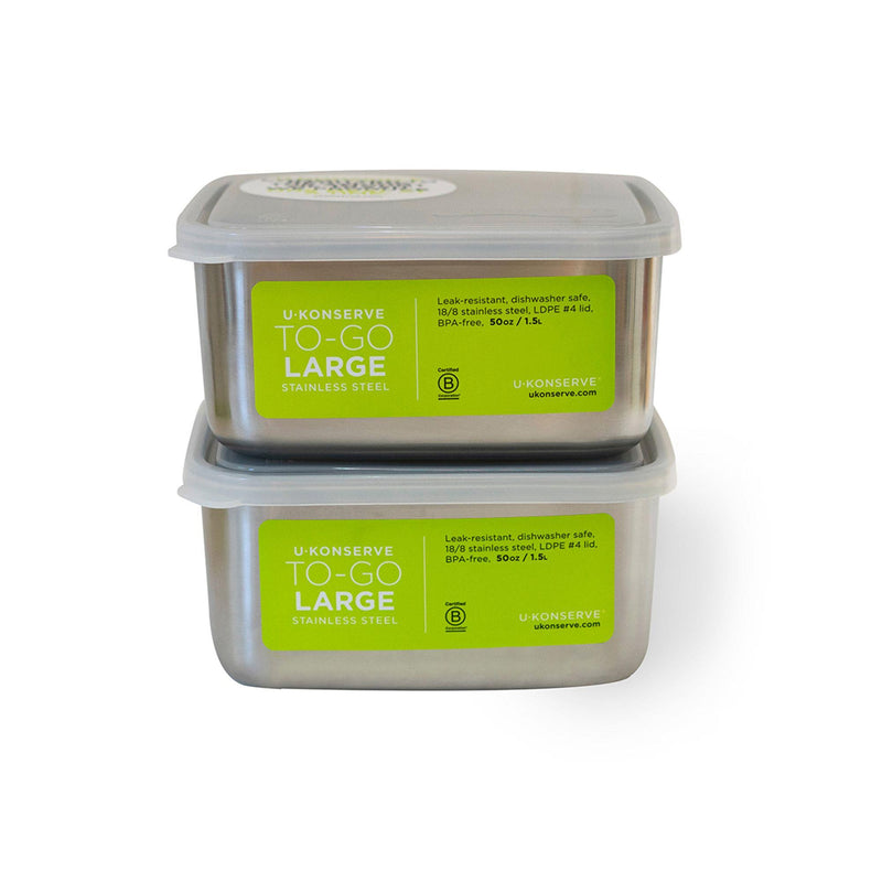 Our boxed set-of-two square food-storage containers is ideal for kitchen organization, pantry makeovers, meal prep and family leftovers. Perfect waste-free solution for daily lunches, picnics, travel, outdoor adventures and bulk shopping. Pack snacks, lunches and main meals while reducing single-use packaging. This stainless steel food-storage set of reusable containers is versatile enough for all food-storage needs at home and on the go, while saving trash from our ever-growing landfills. 50oz container size with lid on: 6.5" x 3" x 6.5".