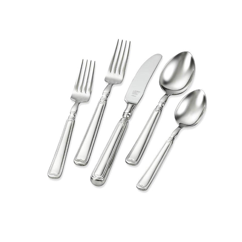 Vintage flatware is inspired by an original Zwilling pattern. Made from high quality 18/10 stainless steel. Created with an optimal combo of 18% chromium and 10% nickel for corrosion resistance. Maintains a long lasting silver-like luster. Dinner knives with mono-block construction for perfect weight and balanced. Dishwasher safe. Includes: (8) Dinner knives. (8) Dinner forks. (8) Dinner spoons. (8) Salad forks. (8) Soup spoons. Slotted Serving spoon. Serving spoon. Serving fork. Sugar spoon. Butter knife. Dishwasher safe.