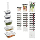 Say hello to fresh food and goodbye to food waste. Store sous vide marinate and meal prep. Slimline pump is rechargeable and space-saving. BPA-free reusable bags feature a secure zip closure. Durable borosilicate glass containers are nestable and stackable. Includes:. 10 Large bags. 8 Medium bags. 8 Small bags. 2 Medium glass containers. 1 Large glass container. 1 Fridge container. 1 Gratin dish. 1 Vacuum pump.