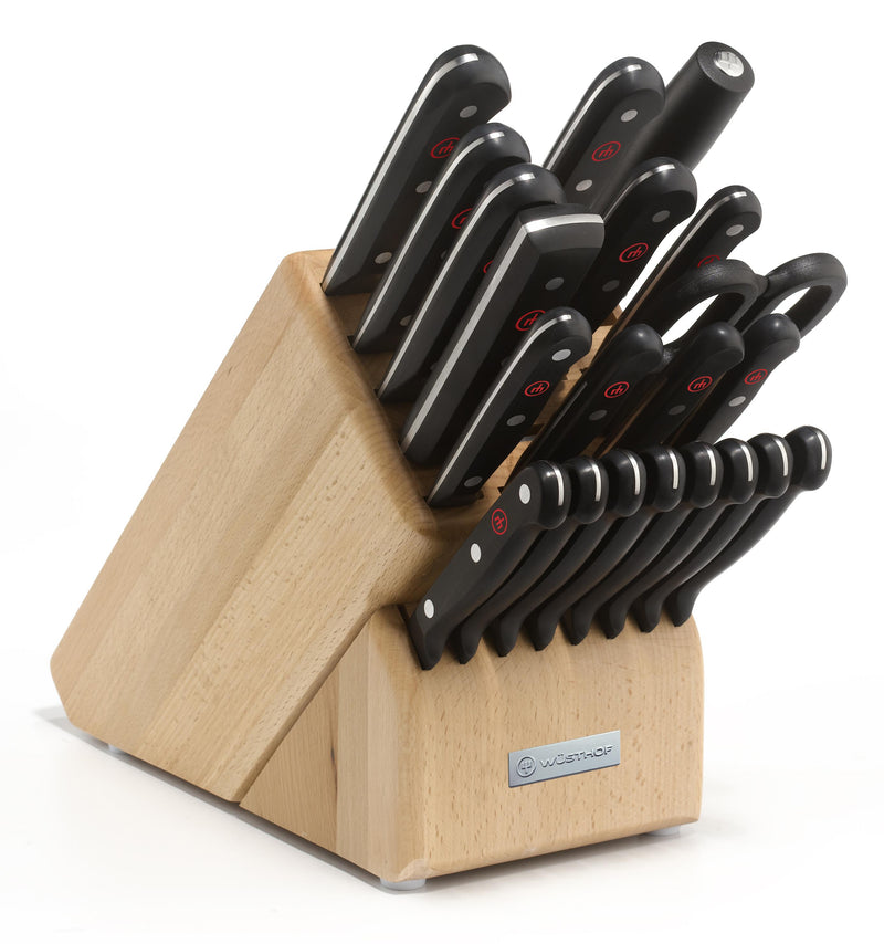 Precision laser-cut stamped blades. Well balanced and durable. High carbon stainless steel construction. Handles have tighter molecular structure to resist fading and discoloration. Recommend hand wash only. Includes: 2.5" Paring knife. 3" Spear Point Paring knife. 3" Serrated Paring knife. 4.5" Utility knife. 4.5" Serrated Utility knife. 5" Boning knife. 6" Utility knife. 6" Cleaver. 7" Hollow Edge Santoku. 8" Carving knife. 8" Bread knife. 8" Cooks knife. 9" Honing steel. Eight 4.5" Steak knives. Come-apart shears. Knife block storage.