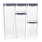Keep your food fresh and your kitchen organized with the POP containers. Store dry foods such as flour rice tea bags sugar and more. POP Containers are stackable so they take up less space on counters. Organize in a combination to fit a counter or pantry. Push button creates an airtight seal and releases it with one touch. Corners are designed for easy pouring. BPA-free construction. Lids come apart for cleaning. Dishwasher safe. Includes: 0.4qt Container. Two 1.1qt Container. 1.7qt Container. .3qt Container.