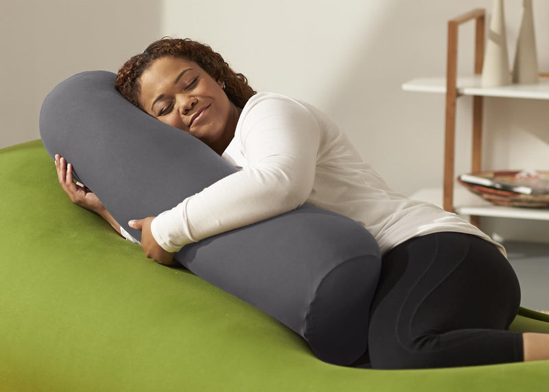 Cozy body pillow for extra support wherever you go. Coziness of a body pillow in a smaller form taking up less space. Add support to your neck knees or back. Filled with fibeads a special combination of micro beads and polyester beads. The filling means the buddy roll will completely mold to your body for ultimate comfort. Outer cover is removeable and machine washable<. Cover materials are made out of a cotton/spandex blend for a soft huggable pillow. 1-Year limited manufacturer warranty. Dimensions: 32" x 8" x 8". Dark gray cover.