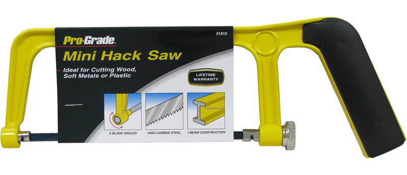 The ProGrade Mini Hacksaw cuts aluminum and other metals, PVC, wood, and plastic tubing. It features a durable ergonomic handle for a comfortable grip and strong, lightweight high-carbon steel blade for quality performance.