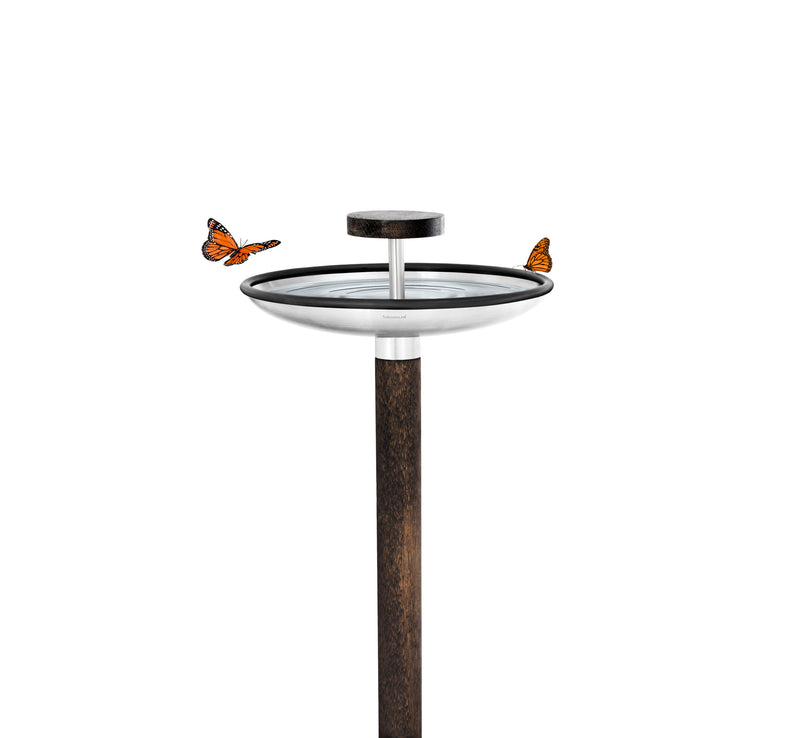 Blomus bird feeder/bird bath is accommodating year round. During the fall/winter months use the bird feeder with weather guard top. Then, during the spring/summer months remove the top and install the included wood perch and fill with water for a bird bath. Year round use. Optional base and support peg available. 18/8 stainless steel top and bottom feeder. Designed by Susanne Augenstein . L 51.97 in. W 10.04 in. H 10.04 in. 4.7 lbs.