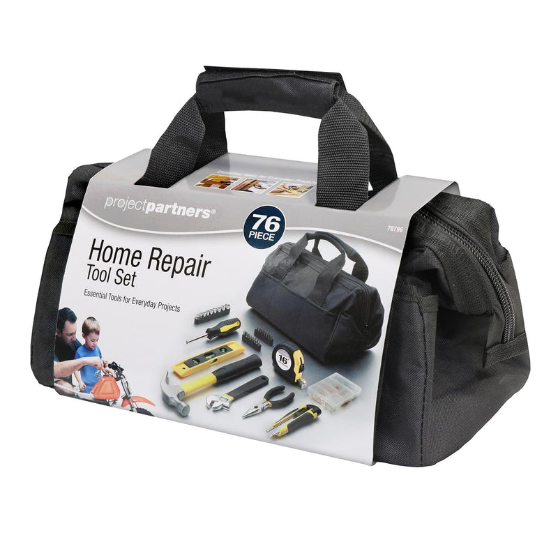 The Allied 76-Piece Home Repair Set features the most popular tools for household projects. This is a great basic array of tools all included in a durable nylon bag.