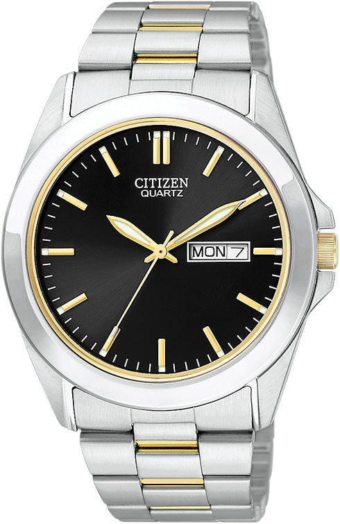 Citizen Men's Quartz Quartz SS Two-Tone Bracelet with Black Dial. Day/Date Feature and Water Resistant, 39.5MM