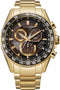 The PCAT from Citizen is an updated take on an iconic design, while maintaining the classic dial. Features include the Tachymeter bezel, a world timer, perpetual calendar, power reserve indicator, chronograph, atomic timekeeping with synchronized time adjustment in 43 cities worldwide and radio control. It has a gold-tone stainless-steel band and 43mm case, with a black dial for a timeless look that can be dressed up or down. Powered by Eco-Drive technology so it charges by any light and never needs a battery. WR 200M