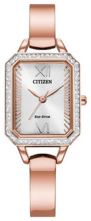 Elevate your look with the Citizen Silhouette Crystal Ladies'' timepiece that features both a striking and elegant appearance. The slim, pink gold-tone bracelet band is surrounded by a sparkling crystal accented bezel and silver tone dial that exudes bold luxury. This three-hand women's watch has a jewelry clasp with a push button and uses Citizen's sustainable Eco-Drive technology to power itself by light. This stylish watch transitions beautifully from a day in the office to a night on the town.
