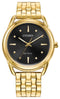 Featuring a bold black dial and gold-tone bracelet, this watch strikes the perfect balance between bold and traditional. This contemporary watch also features a three-hand dial, luminous hands and a fold over clasp with push button for easy access. The Eco-Drive technology keeps the watch powered by any light source so batteries are never needed. This watch provides you with a distinctive look of effortless elegance.