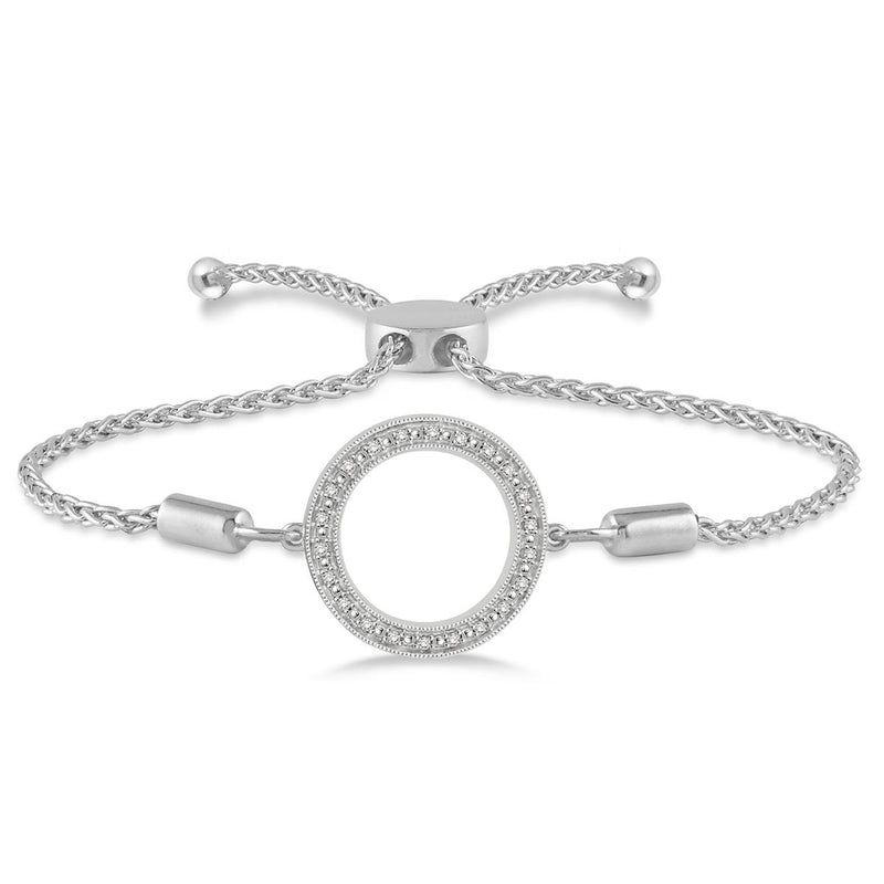 Glamour at your fingertips with this bold Circle of Life sterling silver diamond bolo bracelet that is adjustable to fit most wrists. This versatile wheat chain bracelet can easily be worn alone or layered with cuffs, pearls, and more! The classic open-circle design is embellished with .08twt brilliant-cut diamonds, giving a dazzling effect.
