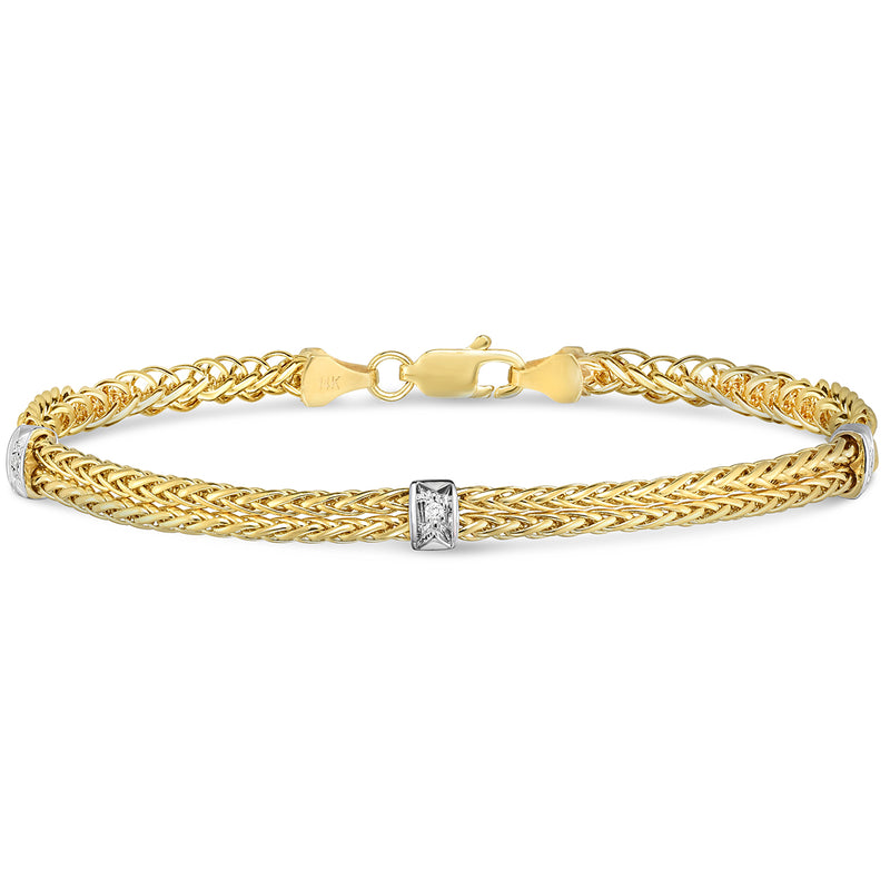 The symbolic strength of gold is softened by the twinkle of diamonds. Eight high-quality 14k yellow gold strands weave together to create a double-strand wheat chain-style bracelet secured with a lobster claw clasp. .03twt Brilliant-cut diamonds set in 14k white gold add sparkle to this 7.25" retro-style bracelet.