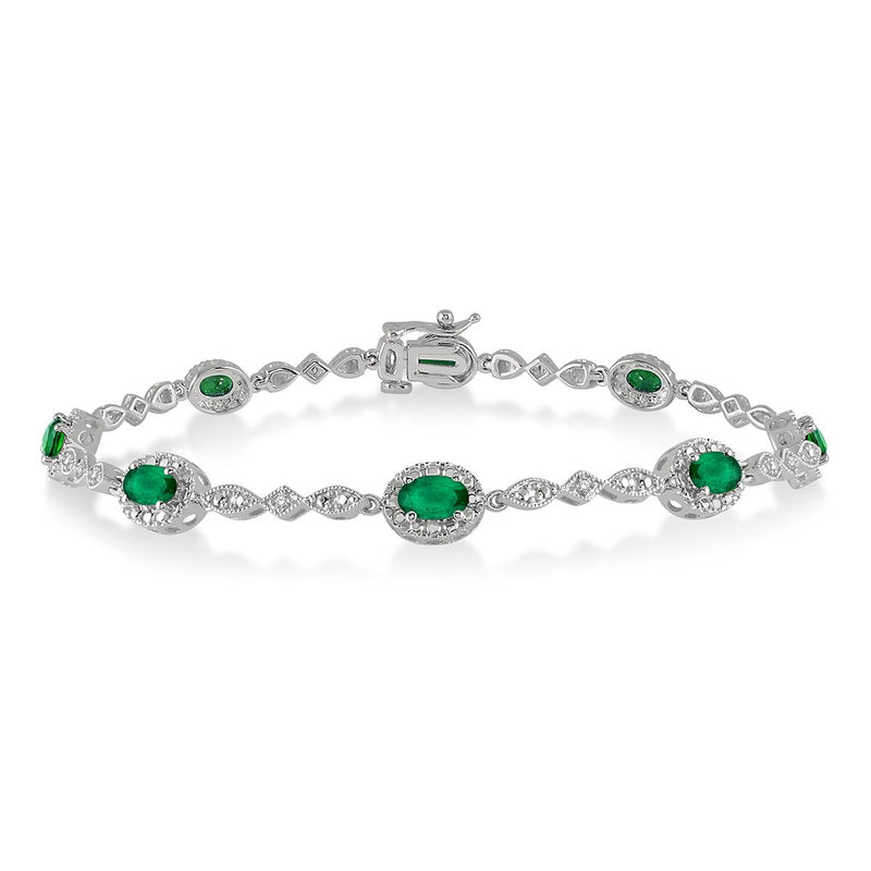 Covet the sacred stone known to preserve love. This bracelet is the perfect example of royal sophistication. Oval-cut emeralds and brilliant-cut diamonds are set in 14k white gold to form an elaborate and elegant link bracelet. Wear it for a casual night out or dressy occasion to add a bit of sparkle to your look. 14k white gold; Length: 7"; Clasp Mechanism: hidden safety clasp; 5x3mm genuine emeralds; Diamonds: .05twt brilliant-cut diamonds