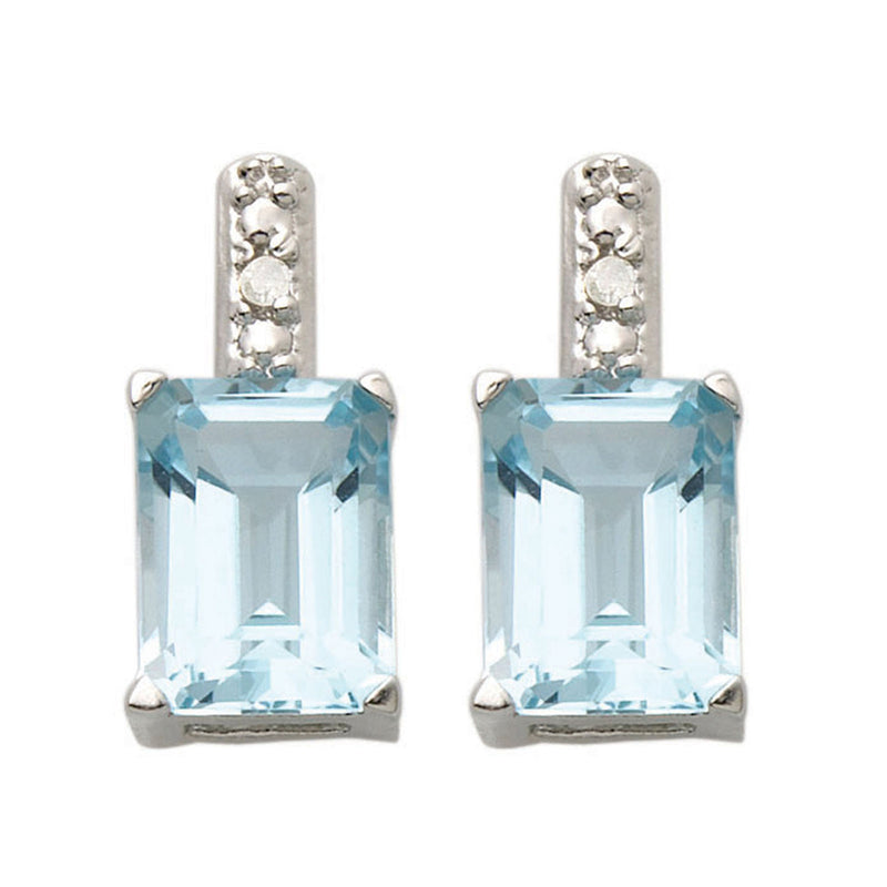 Emerald cut for broader, more brilliant flashes of light. Lovely 8x6mm genuine emerald-cut blue topaz earrings with .02twt round diamonds set in sterling silver. Matches well with 18" necklace JN249-BT.