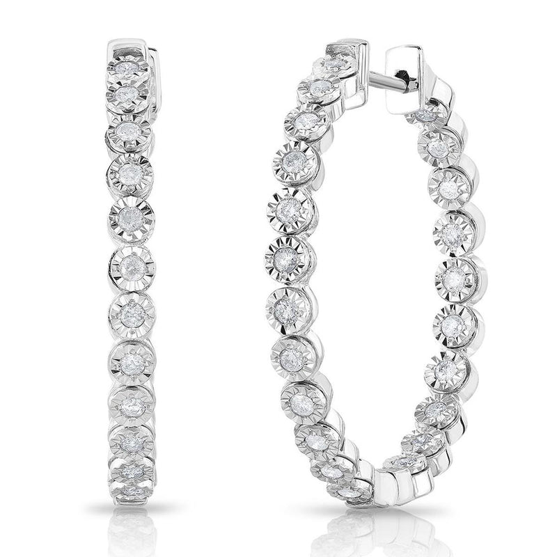 One of the most classic, wear-anytime, wear-anywhere designs, this inside-out hoop is a must-have. These gorgeous 25mm inside-out diamond hoop earrings in 10k white gold are pavŽd inside and out with brilliant-cut diamonds. The diamonds are set in miracle plates, giving the earrings a pretty flower motif and the appearance of double-the-diamond carat weight, creating the ultimate sparkle. Matches well with 7" bracelet JB2719-W. 10k white gold; .75twt round brilliant-cut diamonds