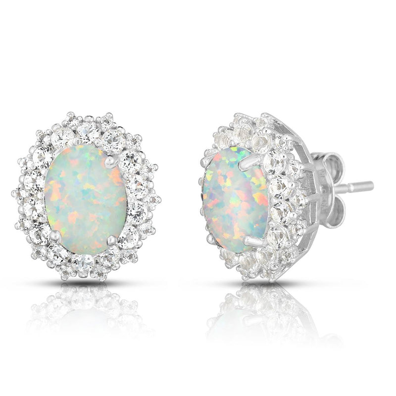 Classic meets chic with these beautiful opal earrings. 8x6mm opals are surrounded by genuine white topaz for added sparkle. Set in sterling silver