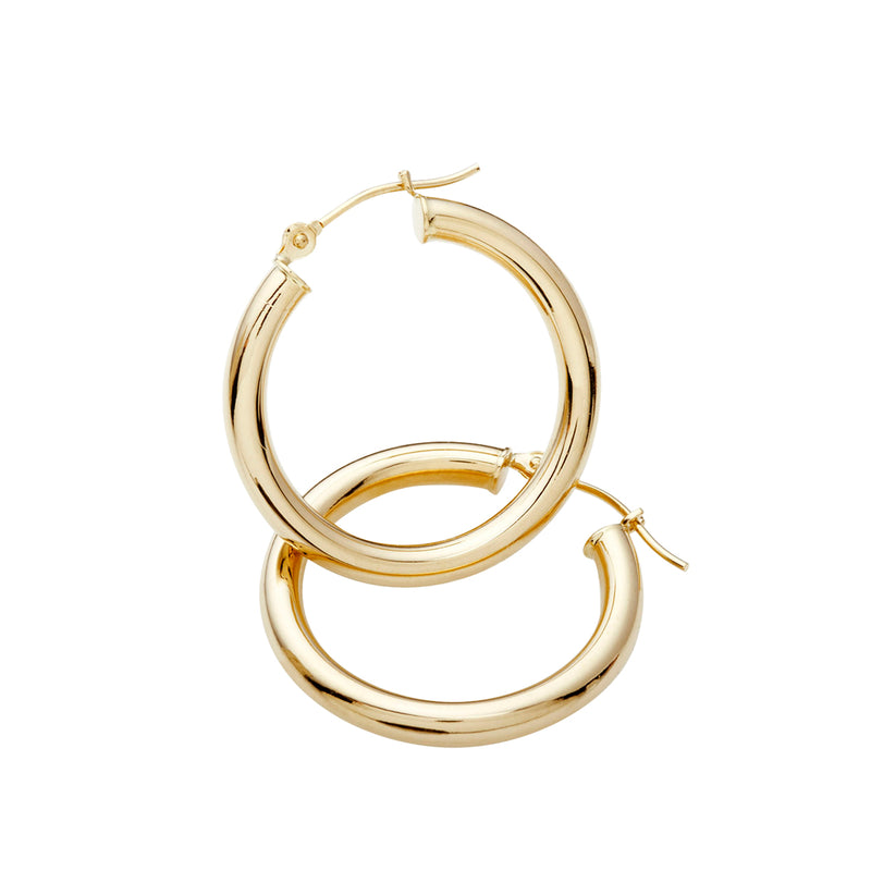 The classic earring that's equal parts chic and retro. Add some pizazz to your jewelry box with these classic 15mm solid 14k yellow gold hoops. 14k yellow gold; 15mm diameter; 3mm thickness