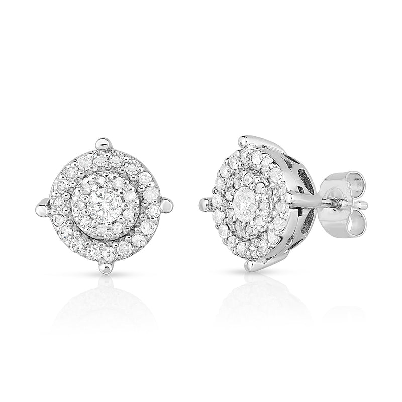 These amazing diamond earrings feature .50twt round brilliant-cut diamonds set in a unique multi-stone design made of 14k white gold. Each diamond brings shimmering flair; together, they brilliantly form a cornucopia of sophistication. Understated enough for daily wear, with just a pinch of pizzazz. They appear three times larger than their actual carat weight. Matching 18" necklace JN576 and 7.25" bracelet JB576 available.