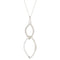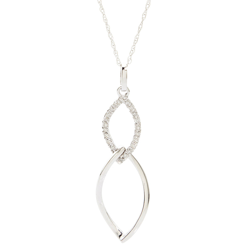 Lustrous 10k white gold entwines to form an ornate infinity, with round glimmering diamonds partially embellishing the infinity. This dazzling pendant is suspended from an 18" rope chain. .10twt round diamonds