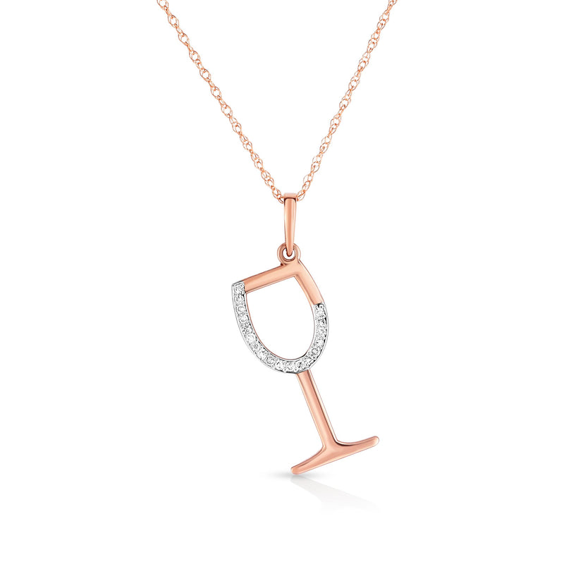 Here's to you! Whimsical diamond wine glass pendant necklace in lustrous 10k rose gold. Features .05twt round diamonds. Suspended from an 18" rope chain.
