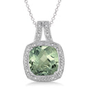 Crafted in luminous sterling silver, this sophisticated and beautiful green amethyst and diamond pendant necklace features a centrally staged cushion-cut 10mm green amethyst gracefully complemented by .05twt sparkling round-cut diamonds. The pendant is suspended from an 18" cable chain. Matches well with earrings JE539-GAM and ring JR539-GAM.