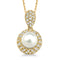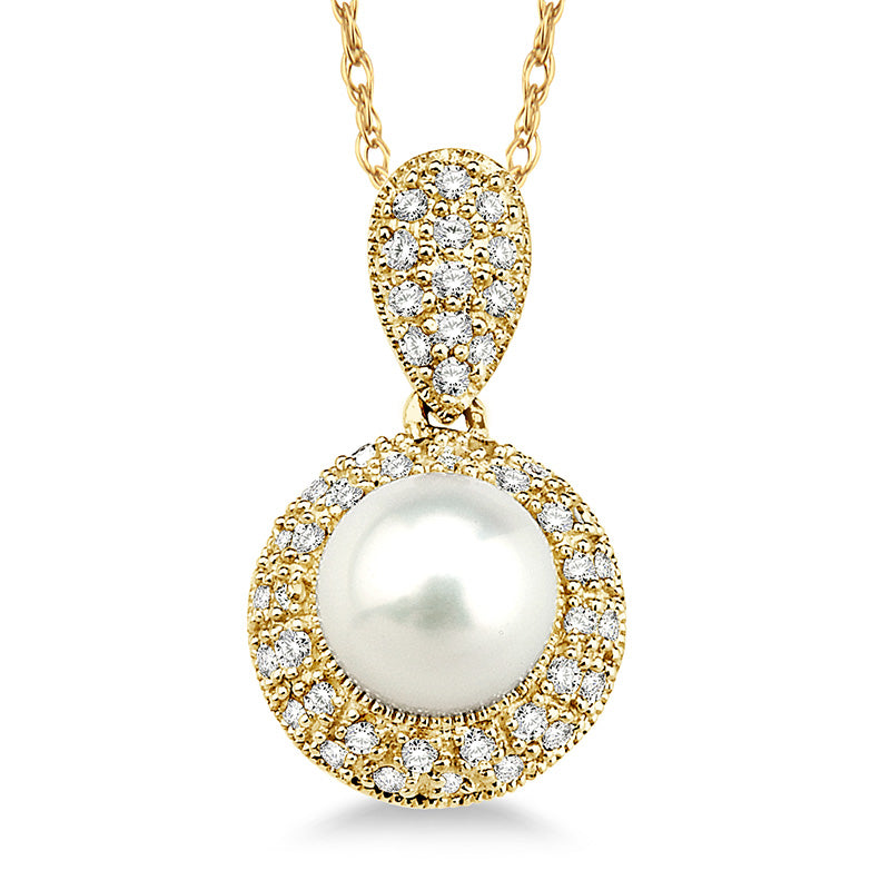 The creative merging of diamonds and pearls says, "This lady has class." A 6mm cultured pearl is surrounded by a round diamond halo set in lustrous 14k yellow gold, with additional diamonds set along the necklace bail. Suspended from an 18" cable chain. Matches well with JE550-Y and ring JR550-Y.