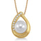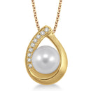 Beautifully crafted in warm 10k white gold, this teardrop-shaped pendant features a large 6.5mm inset cultured pearl enhanced by a sparkling row of .05twt pavŽ-set round brilliant-cut diamonds on one side while the other is polished to a brilliant shine. The pendant hangs from a gorgeous 18" cable chain. Matches well with earrings JE566-Y and ring JR566-Y.