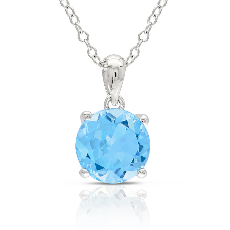 Genuine blue topaz loves to dance in the light of life's best moments. Classic solitaire pendant necklace featuring a 6.5mm round blue topaz set in lustrous sterling silver. Suspended from an 18" cable chain, it matches well with earrings JE649-BT.