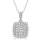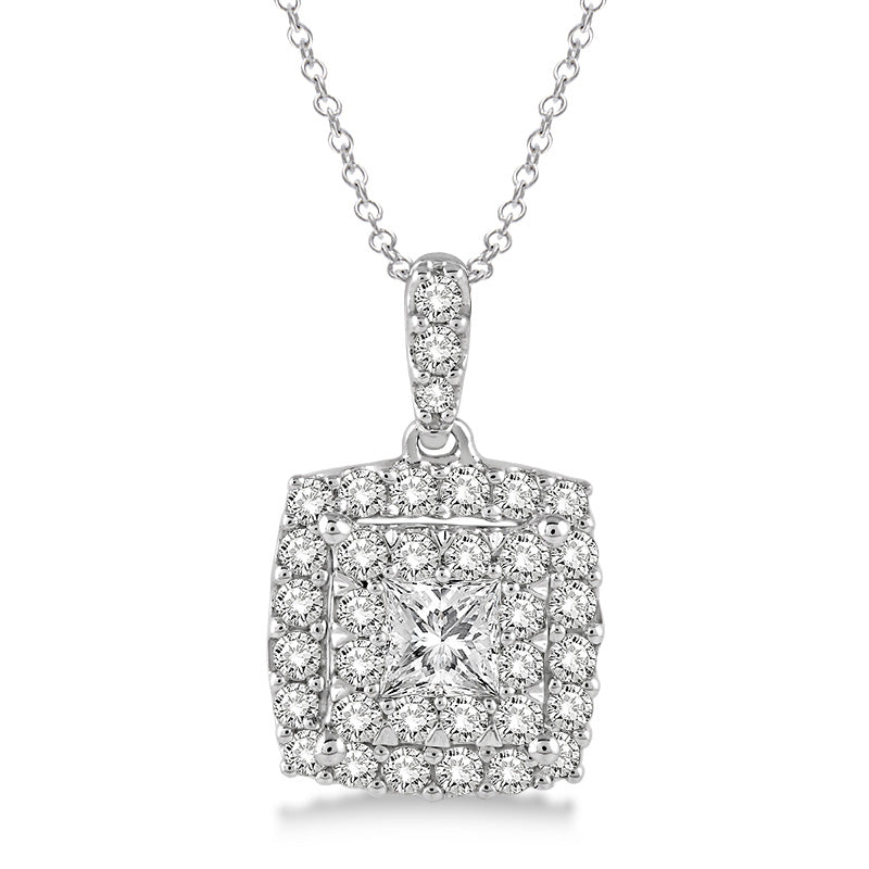 Exquisite diamond cluster pendant with intoxicatingly brilliant diamonds. A square halo of pavŽ-set diamonds surrounds the dazzling princess-cut diamond in the center. This 14k white gold pendant necklace allures with its timeless and sophisticated elegance. Suspended from an 18" cable chain secured with a lobster claw clasp. .75twt of round and princess-cut diamonds.