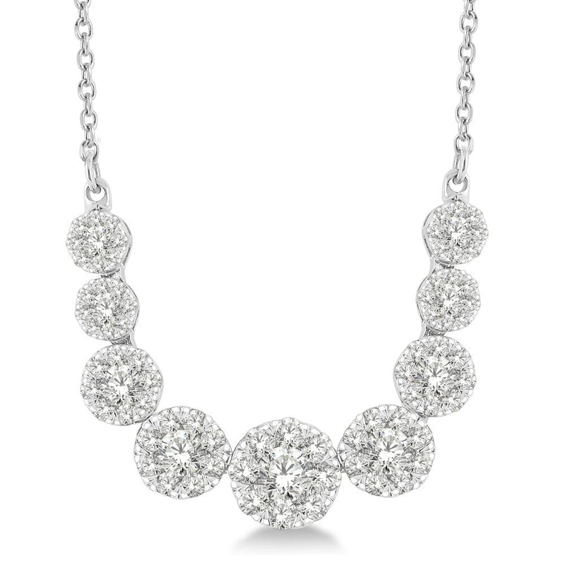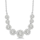 When the occasion calls for a grand entrance, this diamond cluster necklace is here for every milestone. Clusters of round brilliant-cut diamonds are formed and hand-set to maximize the scintillation of each stone. Set in 14k white gold and suspended from an 18" cable chain with a jumpring at 16" for layering versatility. Secured with a lobster claw clasp.