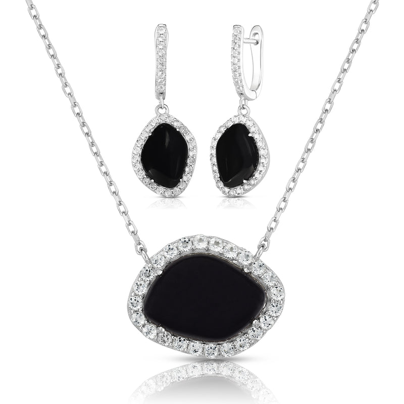 Deco design with a contemporary twist--dazzle and delight with the intriguing look of this black onyx earrings and necklace set. Crafted in high-polished sterling silver, both the earrings and necklace feature an organic-shaped 12x10mm black onyx surrounded by halos of white sapphires. The pendant suspends from an 18" cable chain secured with a lobster claw clasp. The earrings are secured with omega clips and posts.
