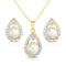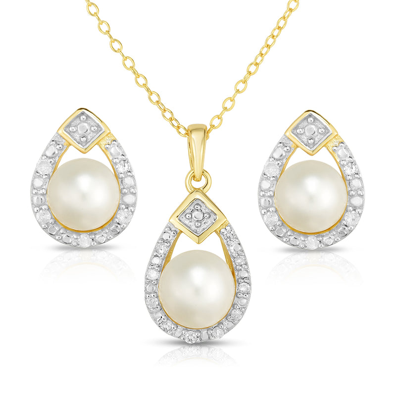 Vintage-inspired freshwater pearl earrings and necklace set with a modern twist! The pendant necklace features a gleaming 8mm freshwater pearl nestled inside a chic sterling silver with yellow gold overlay teardrop pendant. Iced around the perimeter with .10twt round diamonds on an 18" cable chain. The earrings feature 6mm freshwater pearls that are surrounded by beautifully prong-set .10twt round diamonds set in sterling silver with yellow gold overlay. With an elegant look and classic design, this set will be a timeless addition to any collection.