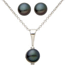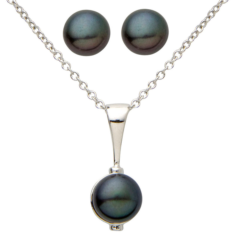 Like a little black dress for your jewelry box. A pearl earring and necklace set with endless wearable potential. 6mm black freshwater pearls with sterling silver to harmonize with any ensemble. The pendant is suspended from an 18" cable chain.