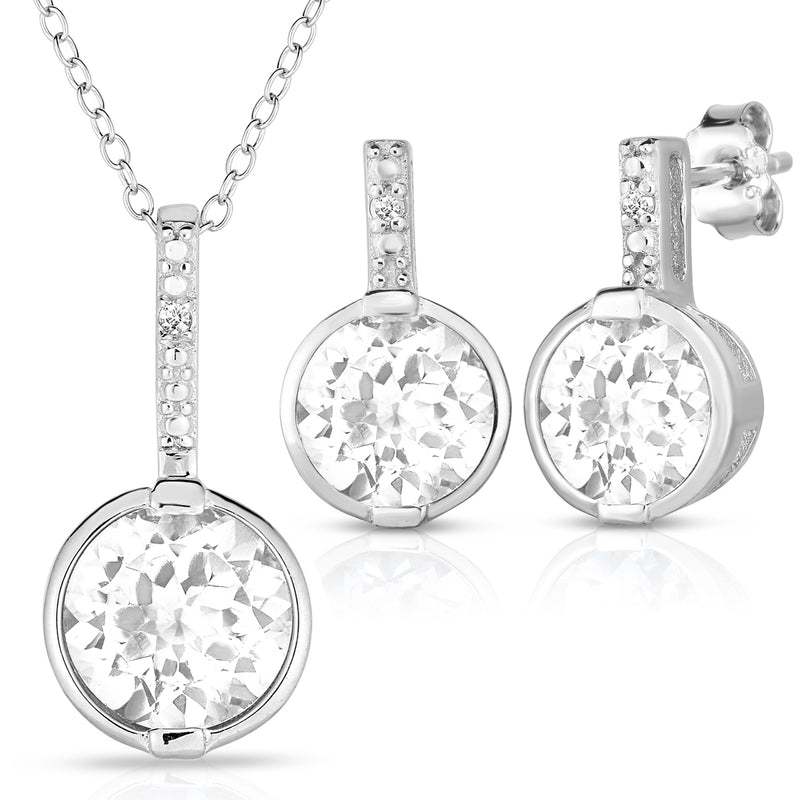 Captivating white topaz meets dazzling diamonds meets "wow". White topaz earrings and necklace set with a splash of diamonds. The necklace features a 10mm bezel-set round white topaz perfectly accented by .01twt round diamonds set in sterling silver. The pendant is suspended from an 18" cable chain. The earrings feature 7mm bezel-set round white topaz accented by .02twt round diamonds set in sterling silver. Matches well with 7.25" bracelet JB247-WTP.