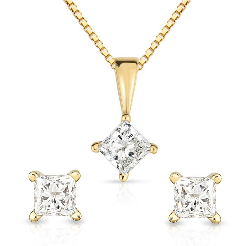 The diamond: A guiding light on your personal journey to beautifying your world, purity personified. The simplicity of a perfect diamond will outlast every other piece you own. A .75ct princess-cut diamond pendant emanates pure elegance in its 14k yellow gold setting. Goes with anything you care to pair it with--another reason why you'll never want to take this set off. Suspended from an 18" box chain secured with a lobster claw clasp. .75twt princess-cut diamond stud earrings