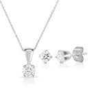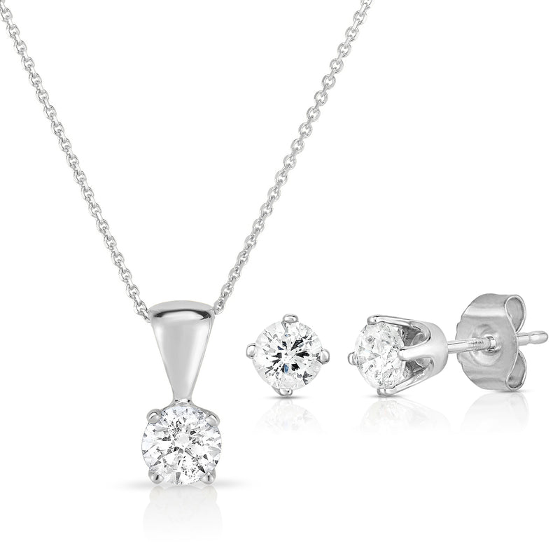 The diamond: A guiding light on your personal journey to beautifying your world, purity personified. The simplicity of a perfect diamond will outlast every other piece you own. Classic diamond solitaire earring and necklace set in 14k white gold. .75twt round brilliant cut diamonds. The earrings are secured with heavy friction posts for added security. The solitaire pendant is suspended from an 18" cable chain.